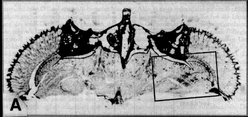 Principle of the method: Radioactive 2-deoxyglucose is taken up by active neurons via the glucose transporter, yet not metabolized. Radioactivity accumulates in active cells. Specimen are freeze dried, sectioned and activity is subsequently recorded by autoradiography. Neuronal activity depends on previous stimulus conditions, see example below: