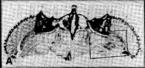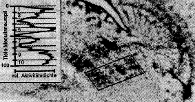 The two neighbouring visual fields stimulated are clearly reflected in the retinotopic arrays of the optic lobe labelled by 2-deoxyglucose. The boxed area has been used to produce the activity profile shown as insert. Note that layers 1, 5 and 9,10 of the medulla are strongly movement sensitive. Compare 2-deoxyglucose staining pattern with Golgi-shapes of L1- and Mi1-neurons (links will be established).