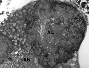 Antennal lobe of a male fly after removing both funiculi (3rd segment) of the antennae. The dark degenerating olfactory axons outline the glomerular structur of the antennal lobe (AL). AN (antennal nerve) labels thick mechanosensory fibres originating in Johnson's organ situated in the 2nd antennal segment that bypass the antennal lobe and project to the mechanosensory center:
