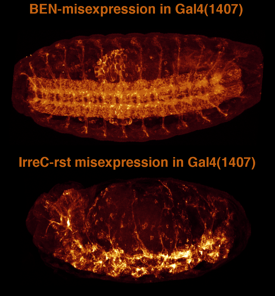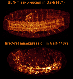 Comparison of UAS-ben and UAS-HB3 (IrreC-rst) misexpression in Gal4(1407) using BEN or IrreC-rst antibodies respectively. BEN acts here as a reporter gene, demonstrating the specificity of Gal4 expression in line 1407 without altering development. IrreC-rst misexpression in the same line causes mutant phenotypes, one example of which is shown here.