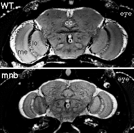 Comparison of brain size and gross brain structure of wild type (WT) and minibrain (mnb) flies. Vertical paraffin sections (using the collar method). Note that the head capsule in wild type and mutant is of equal size (see eye to eye distance), while the brain of the mutant is significantly reduced. cc = central complex; me = medulla; lo = lobula.